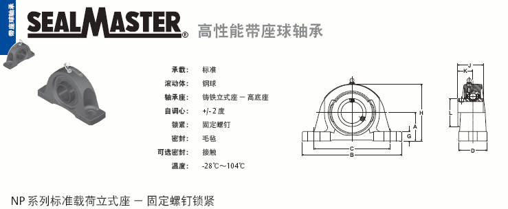 可选密封: 接触,温度:-28℃~104℃, NP系列标准载荷立式座 - 固定螺钉锁紧 |